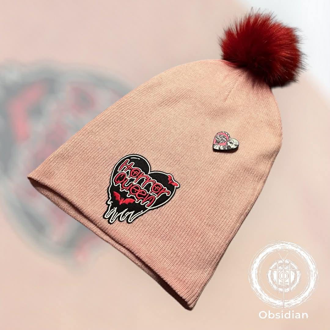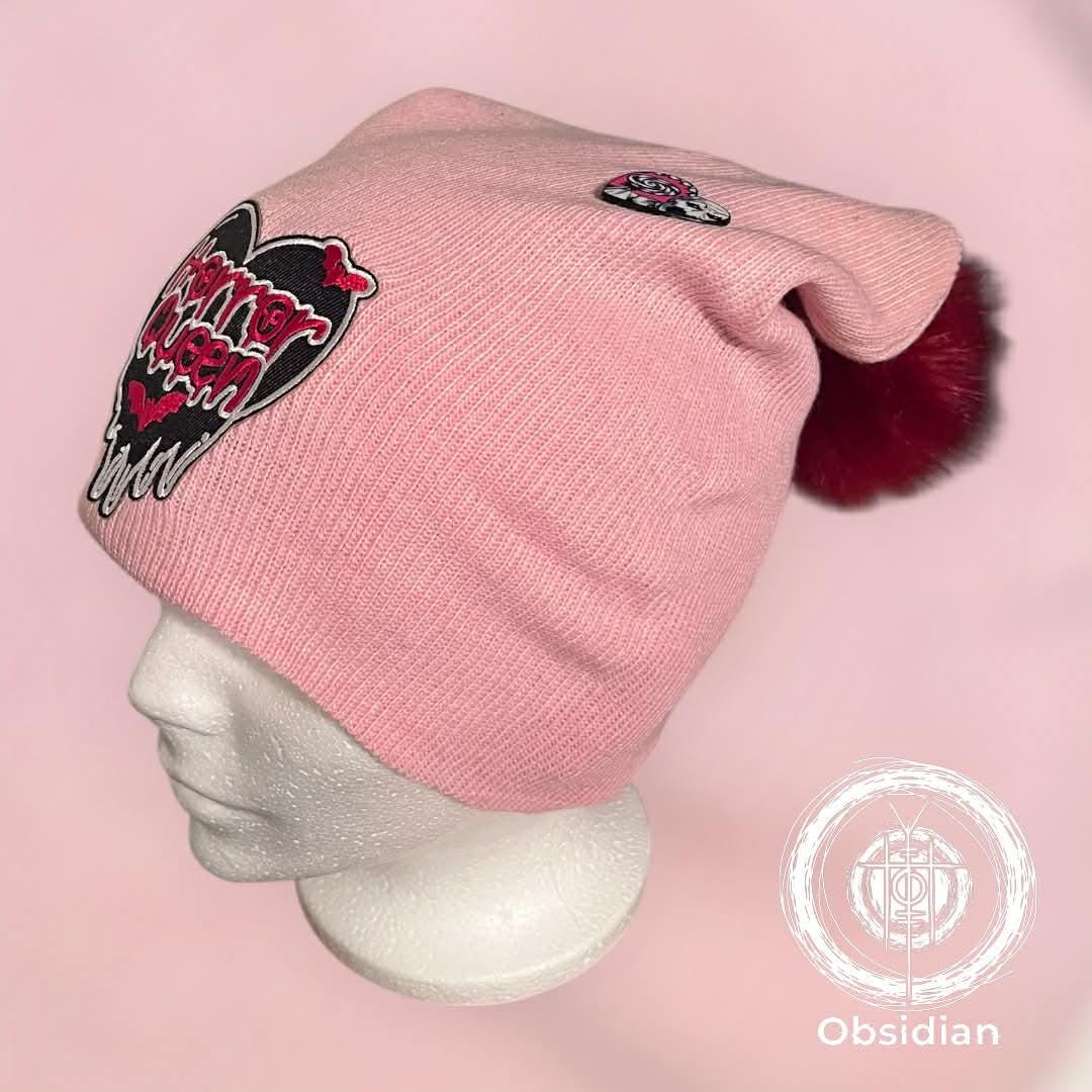 Featuring a soft pastel pink knit topped with a deep red pom-pom, this hat is customized with unique charms and a graffiti-style "Stay Weird" patch that makes a statement without saying a word. It’s the perfect accessory to pair with a leather jacket, band tee, or your favorite winter streetwear.